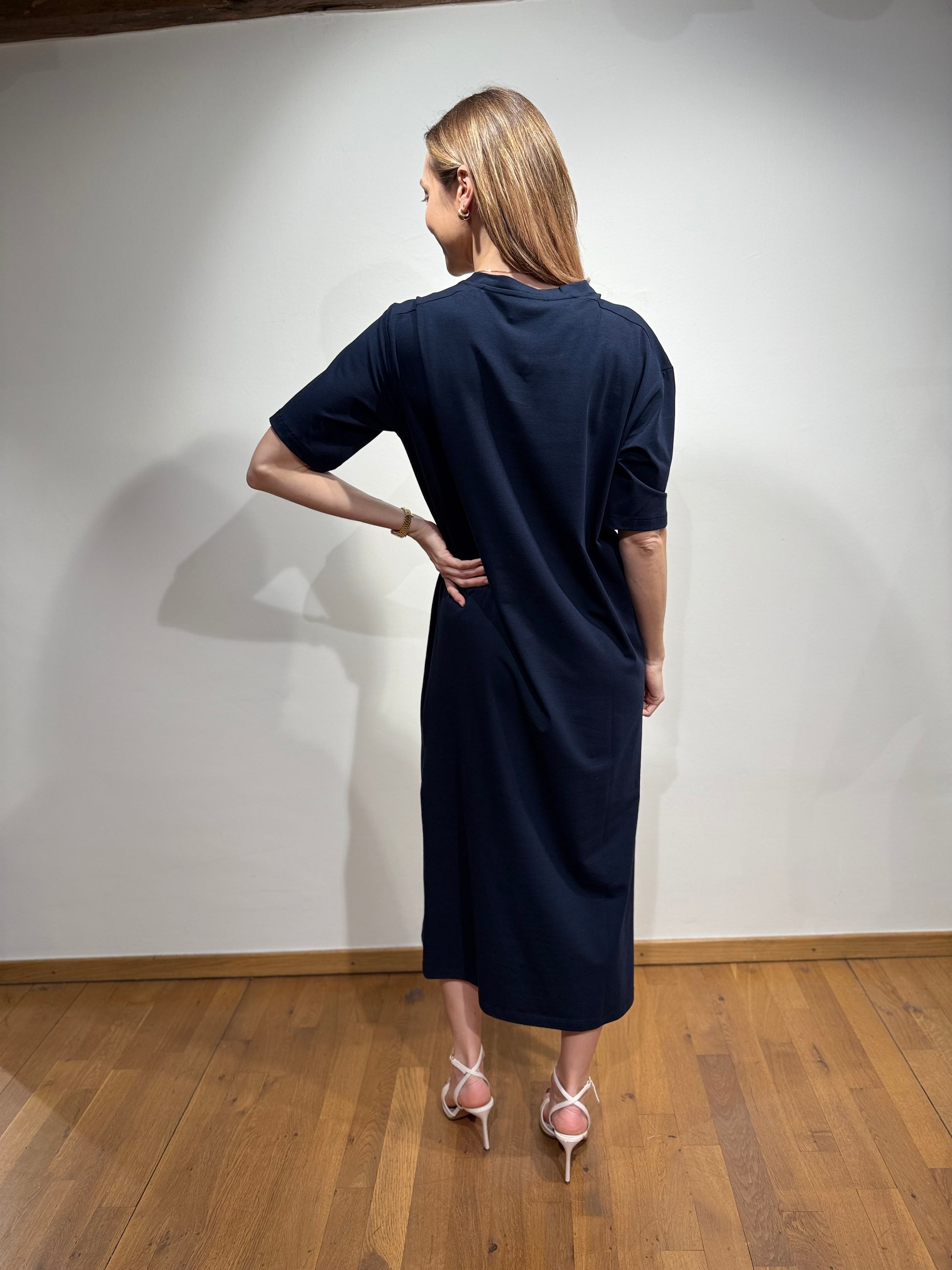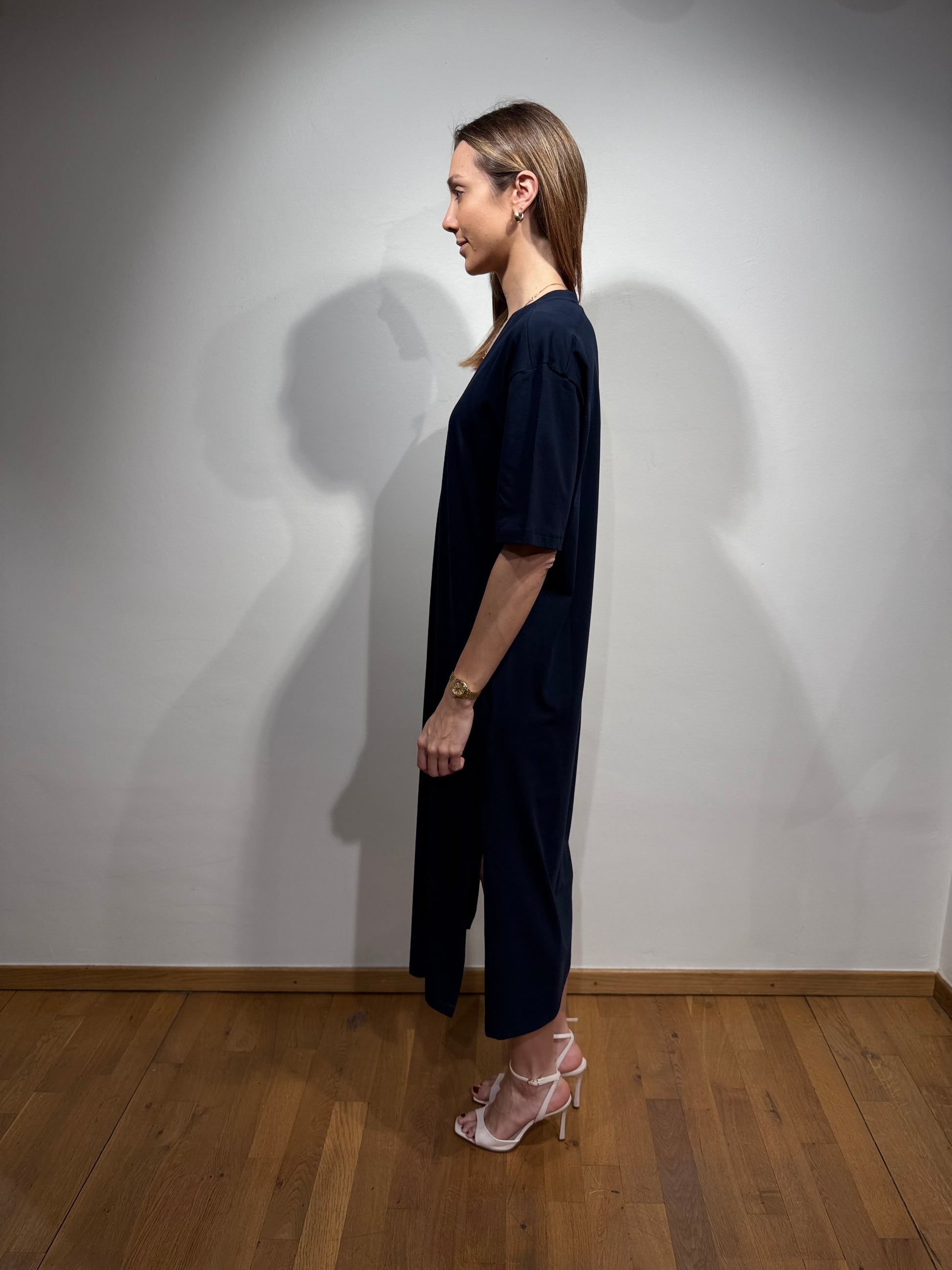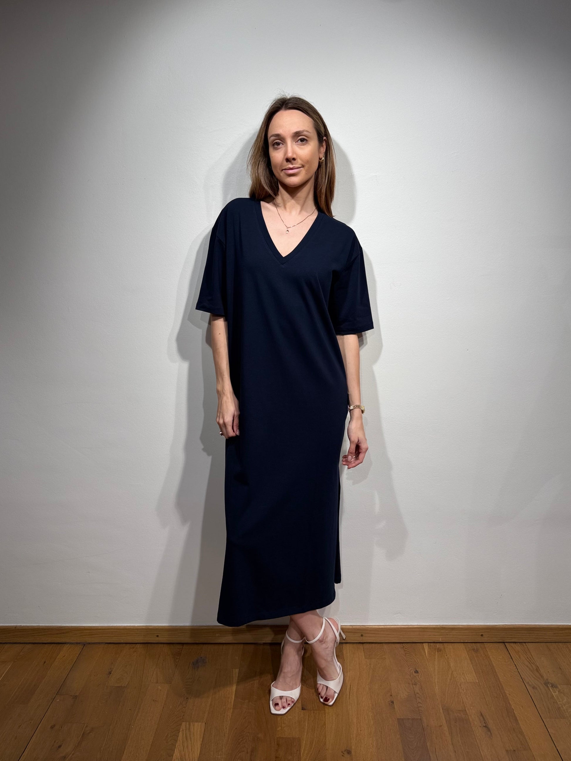Effortless and flattering, this soft jersey dress features a V-neckline, elbow-grazing sleeves, and a clean straight cut. The side slit adds ease of movement and a subtle feminine touch. Made for comfort without compromising style — perfect for both casual days and dressed-up moments.
